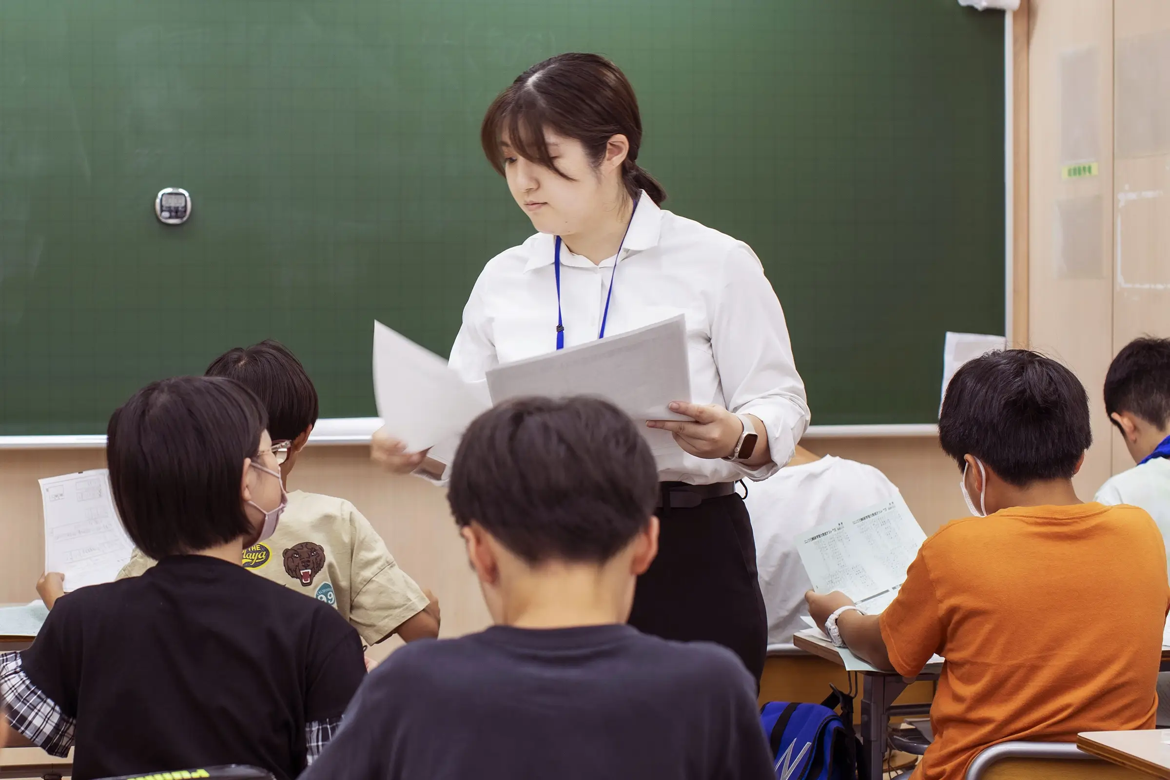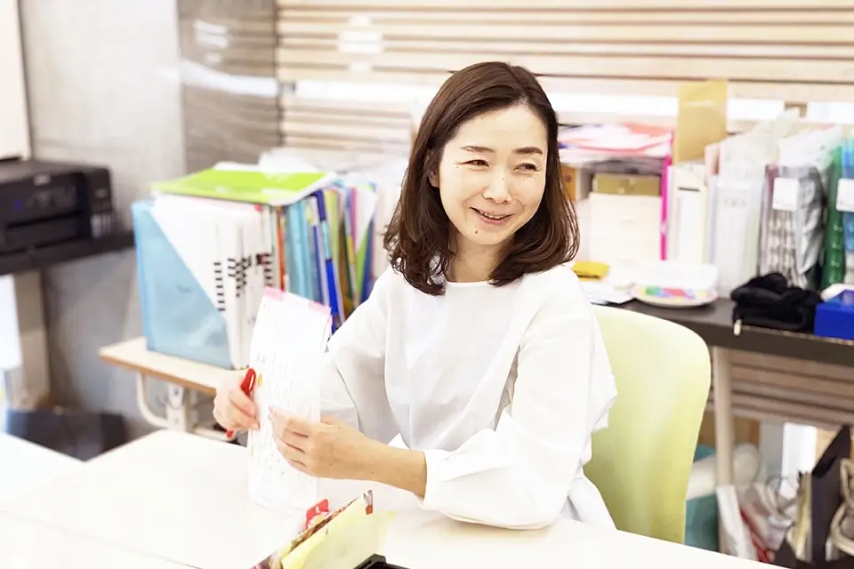 お客様の受付対応や電話のとり継ぎ、授業中に体調を崩した子や質問にやってくる生徒の一次対応をします。ほかに、子どもたちに配布する資料の封入、小テストの丸つけやPCへの入力など、簡単な事務作業を担当します。